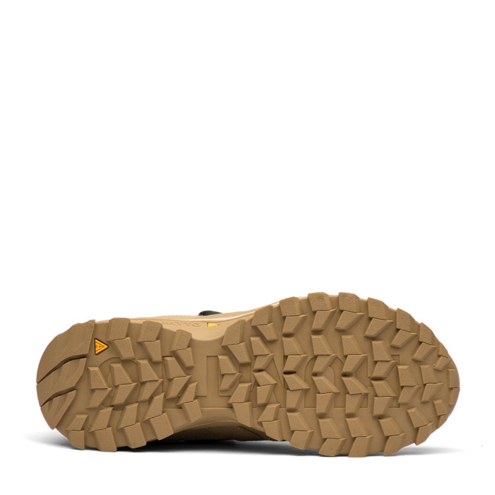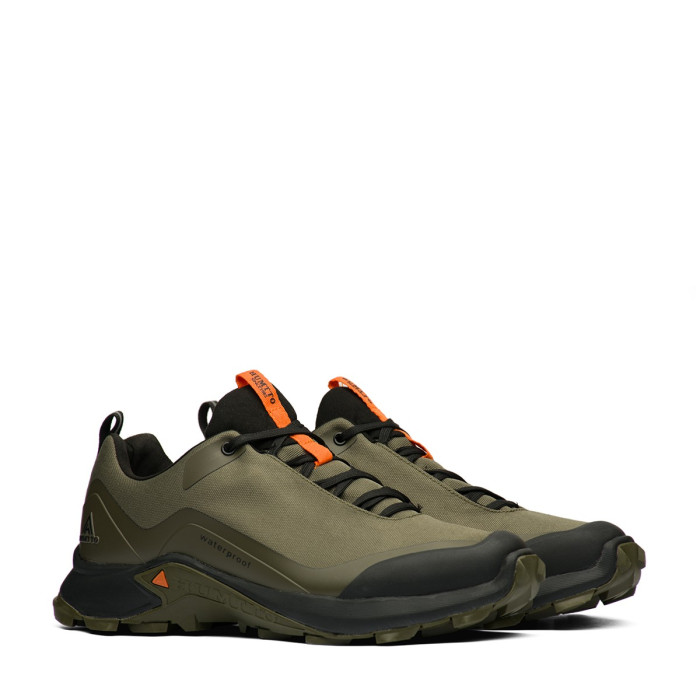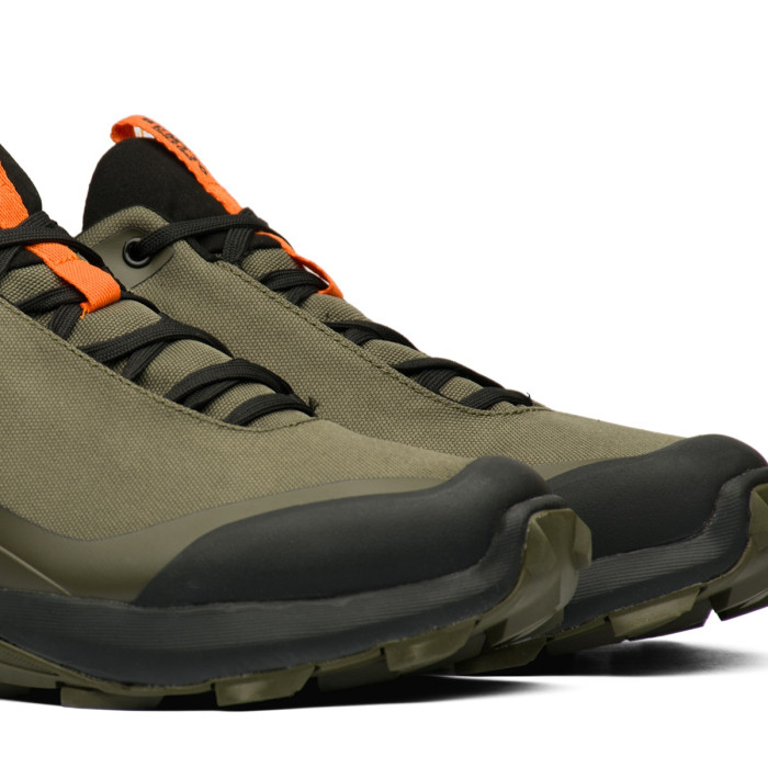 Верх кроссовок выполнен из прочного текстиля цвета хаки, который усилен специальными накладками для дополнительной защиты от повреждений. Ключевым преимуществом являются водонепроницаемые свойства, что делает эти кроссовки идеальными для влажной погоды, защищая ваши ноги от дождя и грязи. Усиленный носок и пятка гарантируют долговечность и устойчивость к износу на неровных поверхностях.