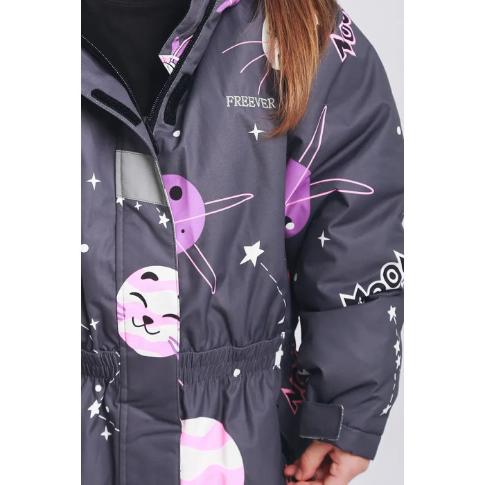 Цей зимовий комбінезон Freever для активних дітей застібається на центральну блискавку з одним бігунком, яка прикрита широкою вітрозахисною планкою на кнопках та липучках, що додатково захищає від продування та проникнення холоду. Для максимального комфорту та адаптації до погодних умов передбачено:
