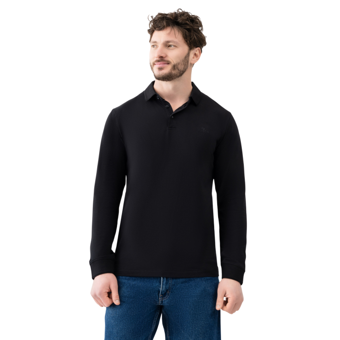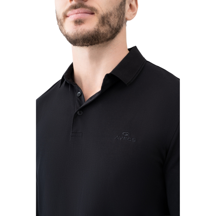 Лонгслів-поло Avecs чорний з трикотажу Double Face — це втілення елегантності та технологічності, створене для чоловіків, які обирають бездоганний стиль у повсякденному житті.