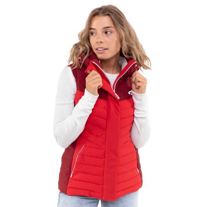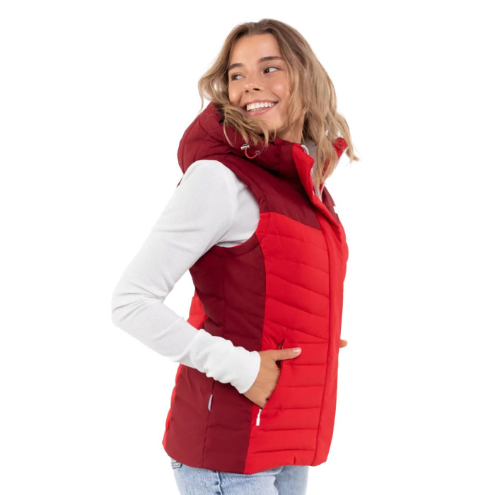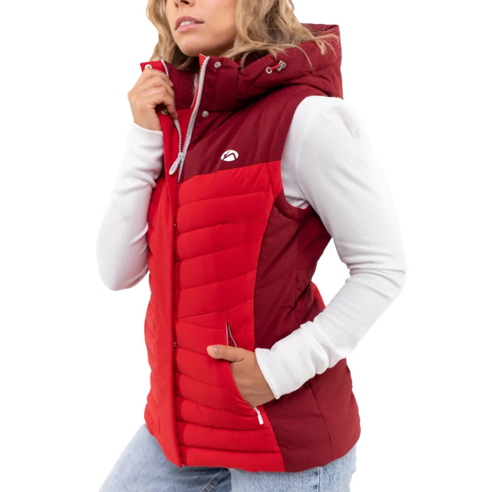 Однією з ключових переваг цієї стильної червоної жилетки є знімний капюшон, що регулюється системою утягування. Це дозволяє легко адаптувати жилетку під різні погодні умови – захиститися від несподіваного дощу чи вітру або зняти його, коли він не потрібен. Комір оснащений мікрофлісовою підкладкою, що створює надзвичайно приємні тактильні відчуття при контакті зі шкірою та додає додаткового тепла. Бічні кишені захищені надійними блискавками, що гарантує збереження ваших дрібниць під час руху.