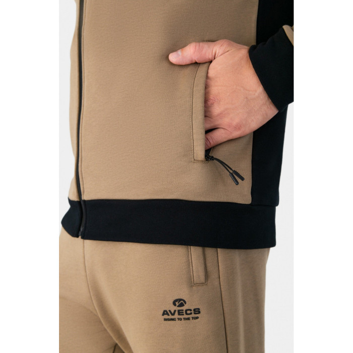 Штани костюма оснащені глибокими прорізними кишенями, що робить їх ще більш практичними для повсякденного використання. Еластичний пояс на регульованих зав'язках-шнурках дозволяє ідеально підлаштувати посадку під вашу фігуру, забезпечуючи максимальний комфорт. Штани на манжеті щільно облягають щиколотку, що сприяє зручності під час тренувань і не перешкоджає рухам. Фірмовий логотип Avecs елегантно доповнює дизайн, підкреслюючи приналежність до відомого бренду. Цей Avecs спортивний костюм з кишенями — ваш надійний вибір.