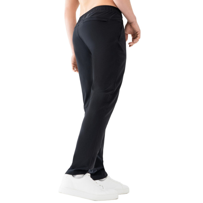 Чорні штани для спорту та туризму мають еластичний пояс на внутрішніх шнурках-зав'язках, що гарантує зручну та надійну посадку. Бічні кишені захищені прорізними блискавками, що не тільки дозволяє безпечно зберігати ваші цінні речі, а й забезпечує додатковий захист від вологи та пилу. Відсутність манжетів додає штанам сучасного, більш вільного вигляду.