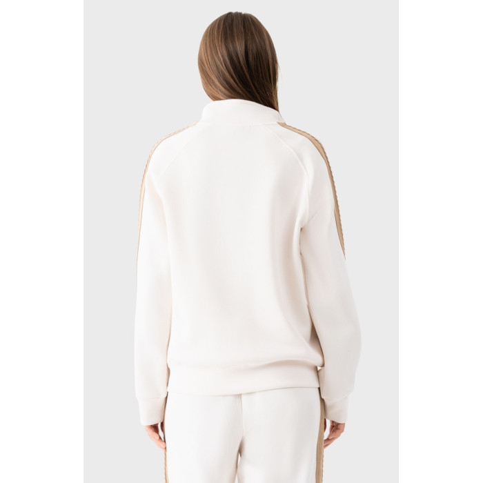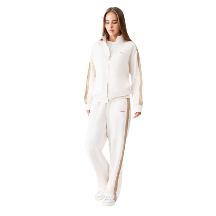 Жіночий спортивний костюм Avecs виготовлений з високоякісного двостороннього трикотажу Double Face, що забезпечує винятковий комфорт під час носіння. Ця унікальна тканина ефективно відводить вологу від тіла та зберігає тепло, що робить костюм молочного кольору ідеальним вибором для будь-якої погоди. М'яка текстура приємна до шкіри та гарантує комфорт протягом усього дня.