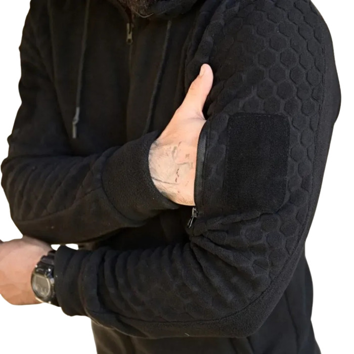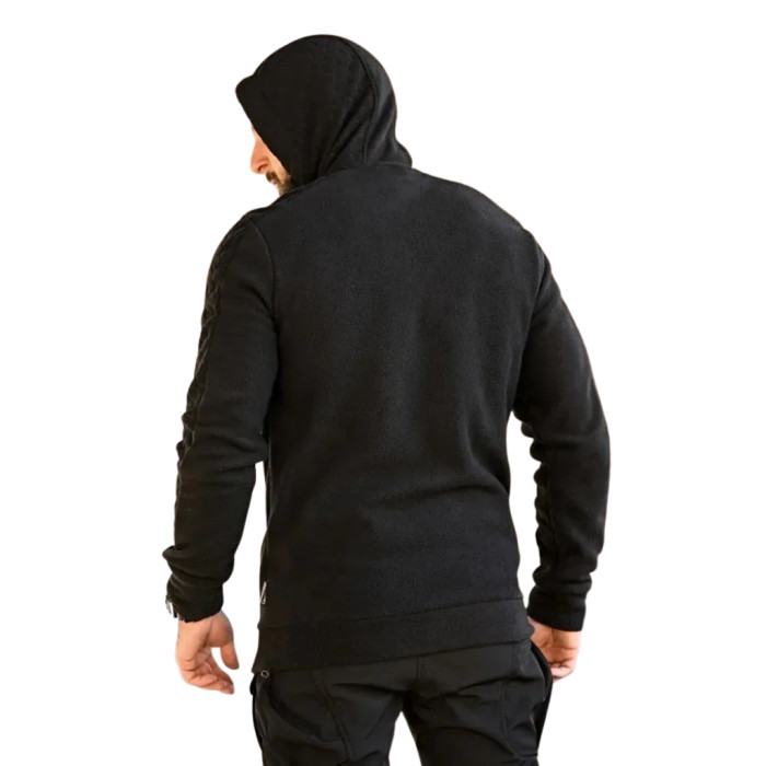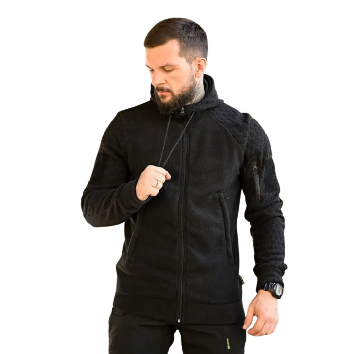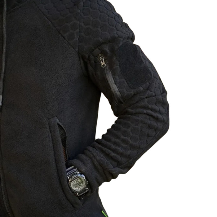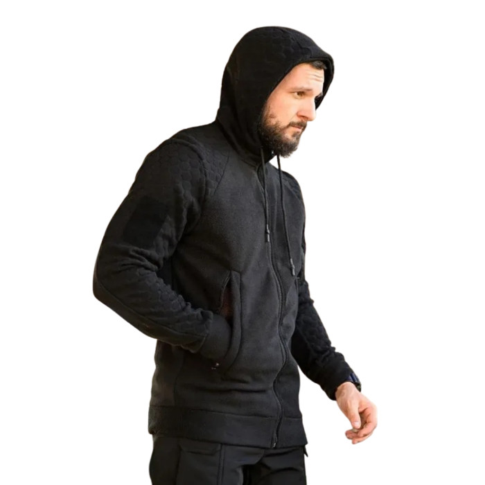 Дизайн моделі виконаний у чорному кольорі з вставками патерну Соті на рукавах і капюшоні. Цей візерунок не лише додає естетики, а й забезпечує маскувальний ефект у певних умовах. Флісова кофта з капюшоном захищає голову та шию від вітру й холоду, а регульований капюшон дозволяє адаптувати посадку під індивідуальні потреби.