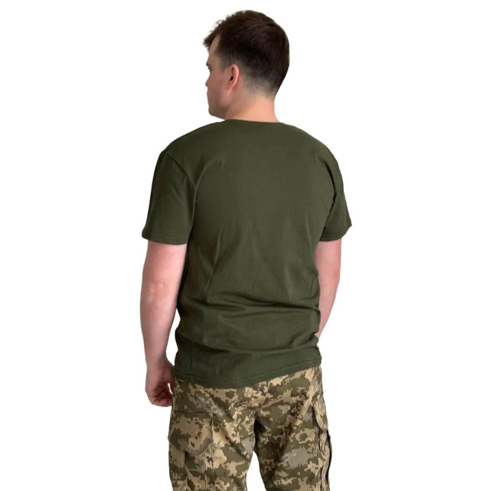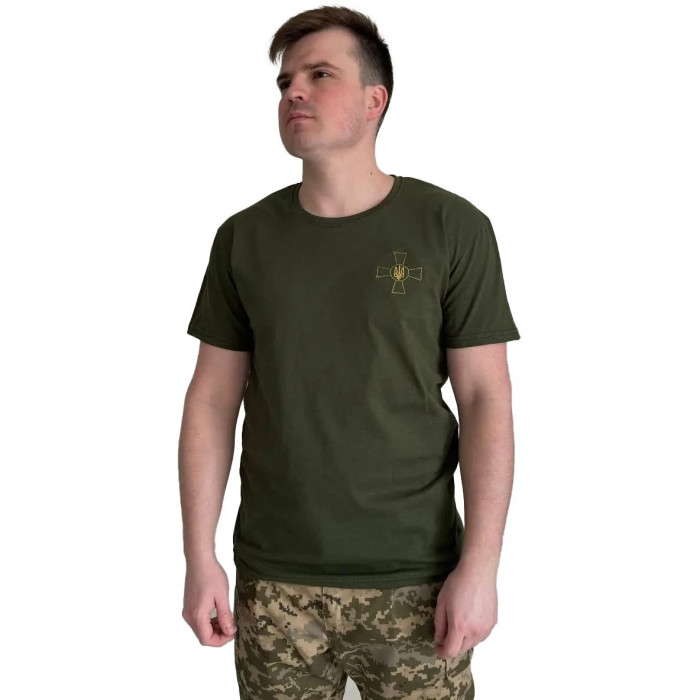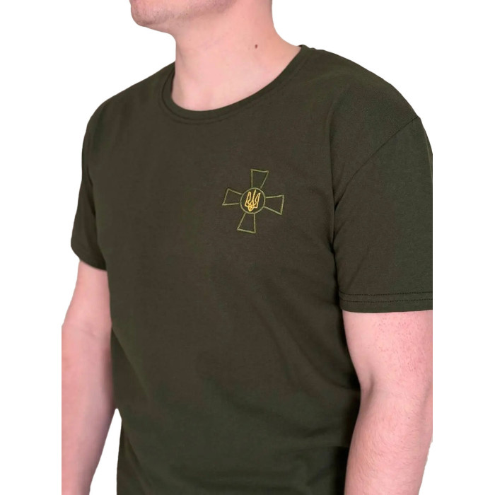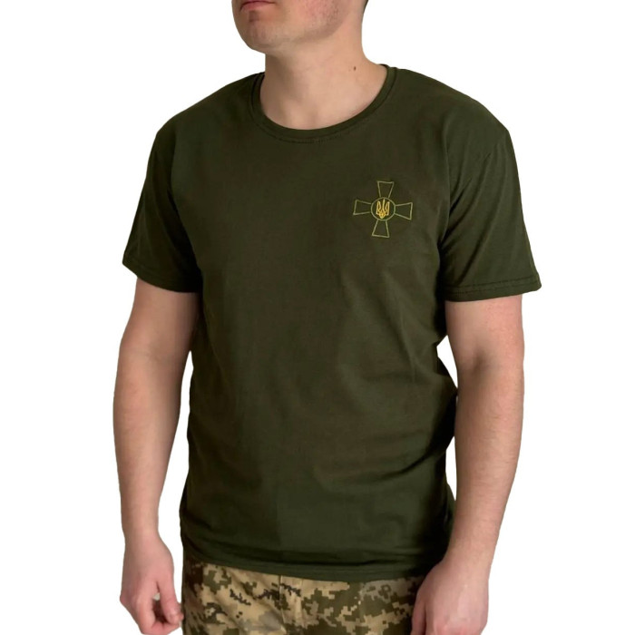 Патріотичний дизайн: Принт у вигляді хреста ЗСУ на однотонній оливковій футболці підкреслює патріотичний характер виробу, дозволяючи висловити підтримку та повагу до українських захисників.